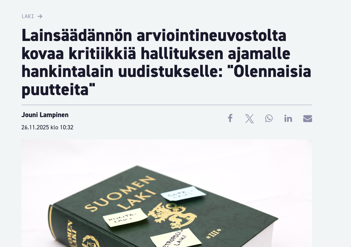 Maaseudun Tulevaisuus: Lainsäädännön arviointineuvosto kaipaa tarkennuksia hankintalakiin – hyödyt ja kustannukset tulisi arvioida paremmin