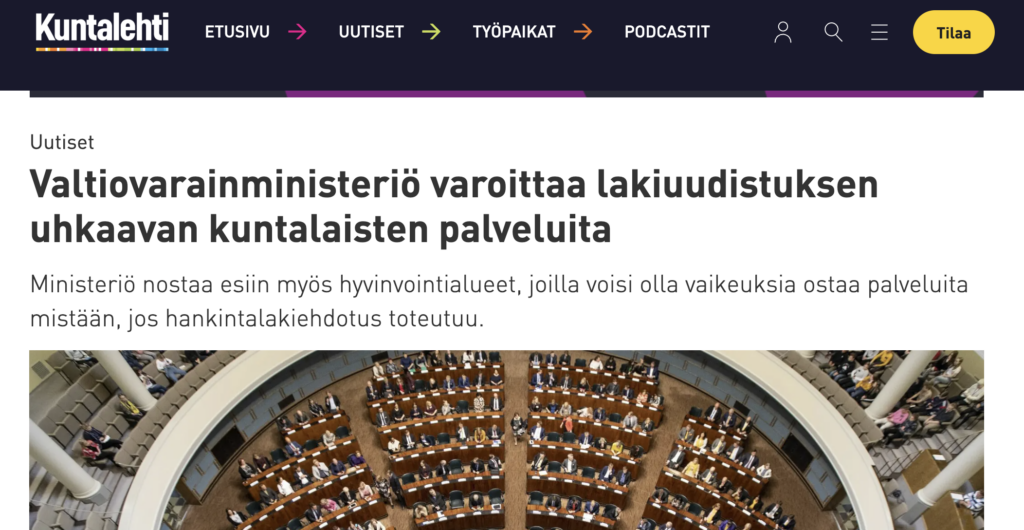 Kuntalehti: Valtiovarainministeriö varoittaa lakiuudistuksen uhkaavan kuntalaisten palveluita