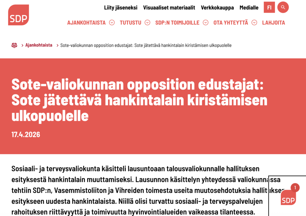 SDP: Sote-valiokunnan opposition edustajat: Sote jätettävä hankintalain kiristämisen ulkopuolelle