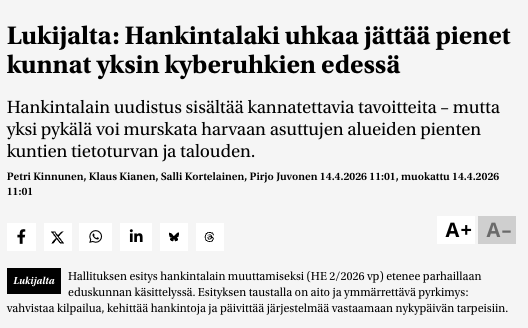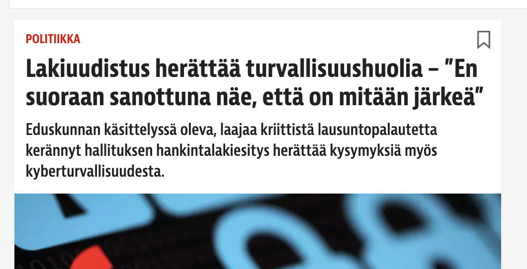 Eduskunnan käsittelyssä oleva, laajaa kriittistä lausuntopalautetta kerännyt hallituksen hankintalakiesitys herättää kysymyksiä myös kyberturvallisuudesta, Iltalehti raportoi.…