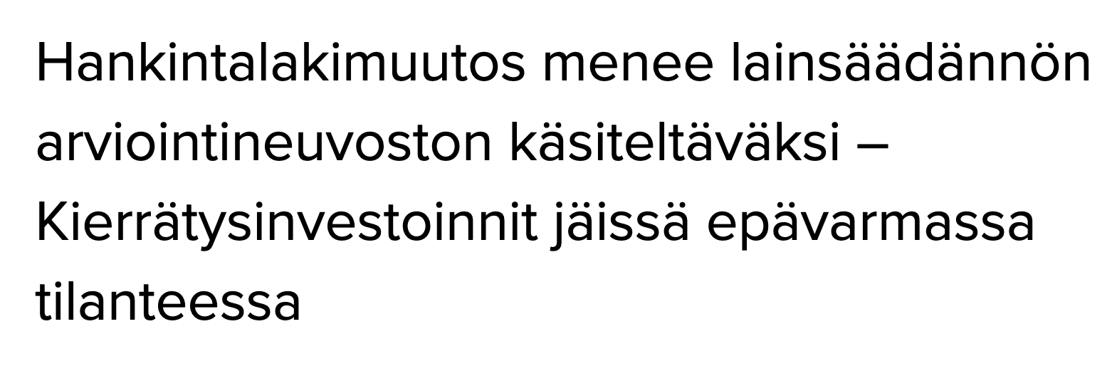 Uusiouutiset: Hankintalakimuutos menee lainsäädännön arviointineuvoston käsiteltäväksi – Kierrätysinvestoinnit jäissä epävarmassa tilanteessa